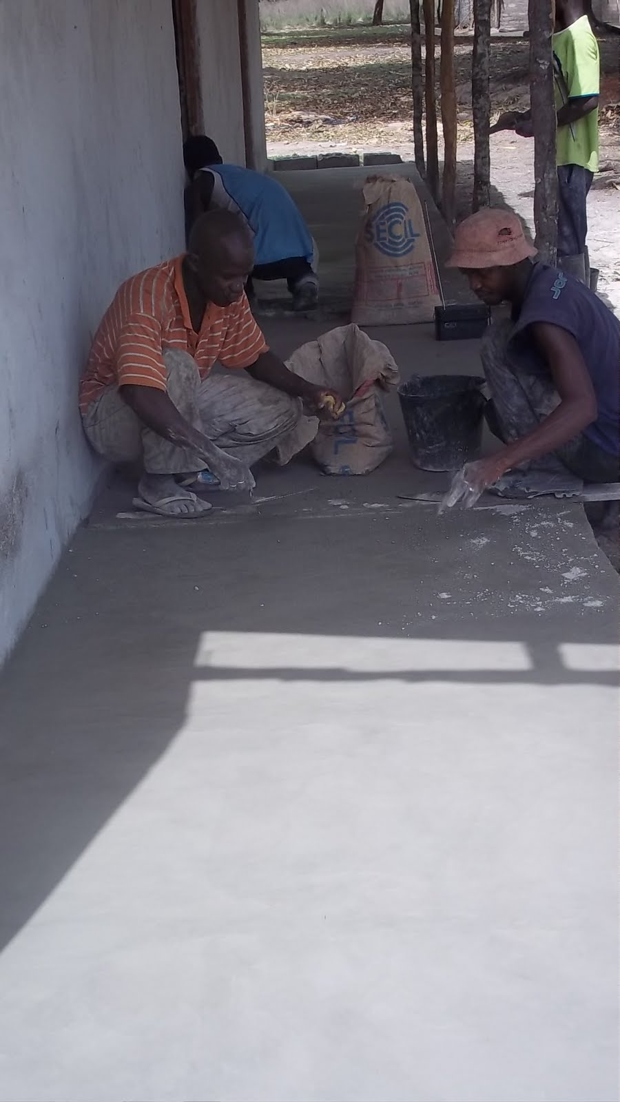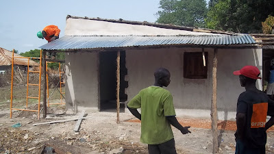 En Abril cuando volvimos se nos propuso poner luz en el taller para poder dar clase por la noche (es la hora en que la mujeres y jóvenes ya liberados de sus trabajos pueden aprender). Por eso se decidió construir un taller más grande, pues se necesitaban mas máquinas y con luz que era lo más importante. Aprovechando la construcción se hizo un almacén para un futuro proyecto de agricultura y una habitación para dormir los voluntarios que viajamos al país (hasta ahora dormíamos en el pequeño dispensario teniendo que levantar los colchones a la hora de pasar consulta).